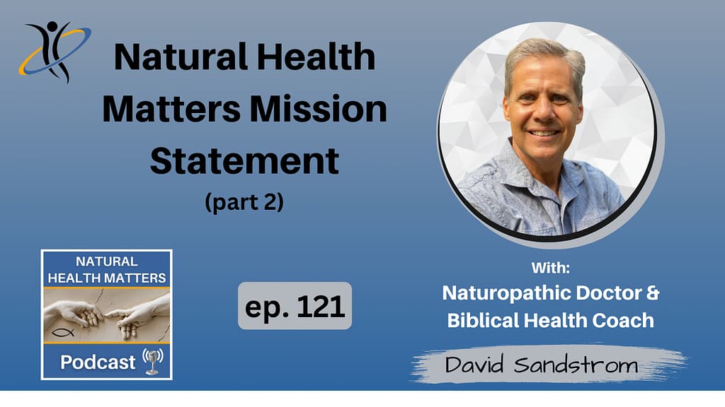 And I also talked about allopathic medicine versus nature, apathy, and how the naturopathic approach to health is closely aligned with biblical teaching. And I also talked about the love of God. And if we really understood we can really wrap our minds around the love of God, we wouldn't hesitate to run to Him and to do things his way. And when we do things his way, we can expect better outcomes, no guarantees. But that's just the way things work. So if you haven't listened to Episode 120, I encourage you to go back and listen to that episode. Now, I think you'll get a lot more out of this one if you do that. So I've really been looking forward to doing both of these episodes for quite some time. I've last year, so I've had a lot of guests on and I really appreciate them sharing their wisdom with us with the natural nation. But a lot of times, even though those guests are very, very knowledgeable, very smart people, great practitioners helping people. Sometimes their message is a little convoluted and not really concise. They haven't really taken the time to distill their message down and really refine it and be able to communicate it really well. In 30 or so minutes. It's a very difficult thing to do. And few people actually do that. Well. I'm going to do my best to do that for you here today. You know what I wrote my book, The Christians guide to Holistic Health, I met with an author very successful authors Her name is Shaun T Feld on and she sold over a couple million copies of marriage and relationship books. And she told me, you know, Dave, writing a book is great, but don't underestimate how difficult it's going to be to really refine your message and be able to get that message across in a very short period of time. And I listened, but I really didn't realize how spot on she was until I tried to do it, it really is a difficult thing to do. So here I am 120 episodes into the podcast, and are just now and feeling like I'm starting to really get the message together in an understandable way that people can understand. So I want to take this opportunity to be really unambiguous about my approach to health, and why I recommend the things that I do and when we when it comes to improving our health. But also, I want you to understand what the mission of this podcast is what what I'm trying to accomplish here. And it can't be done in five minutes. That's why I decided to do it in two episodes. And we've got a lot of ground to cover here. So fasten your seat belts, seat backs and tray tables in their upright and locked position. Electronic devices turned on episode 121. Part two of the natural health matters mission statement is ready for takeoff. So I want to help you maximize your health potential so that you can look and feel your best at any age. And we do that by aligning our lives more fully with God's natural design for spirit, mind and body. And when I say that I'm well aware that most people don't really understand the depth of what's in that statement. I know that's true because I was a practitioner with a brick and mortar office being paid to do health coaching. And I didn't know what Holistic Health was. So how's laypersons Sanchez? So that's why I want to really kind of clear the air and really define and unpack these words and what that really means. Human beings are spirit